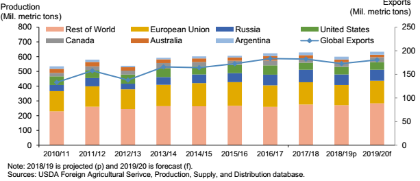 Неблагоприятная погода повлияла на прогноз производства пшеницы в 2019 году для нескольких ключевых стран-экспортеров. В США погода в начале зимы сократила оценки уборочных площадей, снизив производство пшеницы более чем на 1 миллион метрических тонн. Продолжительные засушливые условия привели к дальнейшему сокращению производства в Аргентине и Австралии, на 0,5 и 0,8 млн. тонн соответственно. Тем не менее, улучшение прогноза производства пшеницы в 2019 году в Европейском Союзе (повышение на 1,0 млн. метрических тонн) и в России (повышение на 1,5 млн.) более чем компенсировало сокращение производства в других странах. Совокупное мировое производство повышено примерно на 0,3 млн. метрических тонн в этом месяце и поддерживает увеличение прогнозируемого мирового экспорта в 2019/20 году на 1 млн. метрических тонн (рис. 1)