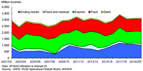 o С учетом снижения производства яровой пшеницы и твердой пшеницы, производство всей пшеницы в 2019/20 маркетинговом году сокращено почти на 42 миллиона бушелей.