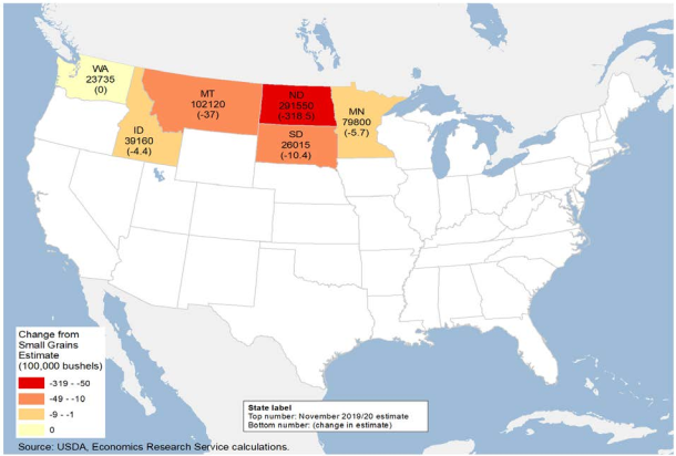 USDA, NASS опубликовало пересмотренные оценки производства яровой пшеницы в отчете об урожае от 8 ноября — обновлении обычно «окончательного» прогноза производства, опубликованного в конце сентября. Существенные осадки в конце сезона, в том числе снег и отрицательные температуры на Северных равнинах, приостановили сбор урожая в ряде штатов, производящих яровую и твердую пшеницу, что потребовало проведения повторного опроса. Основываясь на результатах опроса фермеров, выращивающих яровую пшеницу, оценки уборочной площади яровой пшеницы (главным образом, твердой краснозерной яровой пшеницы) были уменьшены по сравнению с отчетом от 30 сентября для всех опрошенных штатов, кроме Вашингтона (рис. 3). В сочетании со снижением прогнозируемой урожайности в Южной Дакоте, производство яровой пшеницы снижено более чем на 6 процентов по сравнению с предыдущей оценкой.