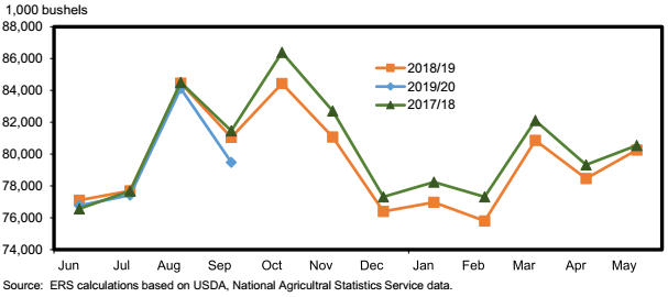 o К концу сентября предполагаемое продовольственное потребление отстало от темпов, которые, как ожидается, позволят достичь прогноза в 960 миллионов бушелей. Исходя из текущих и прогнозируемых данных, продовольственное потребление на 2019/20 г. сокращено на 5 млн. бушелей до 955 млн., сопоставимых с потреблением в 2018/19 г.