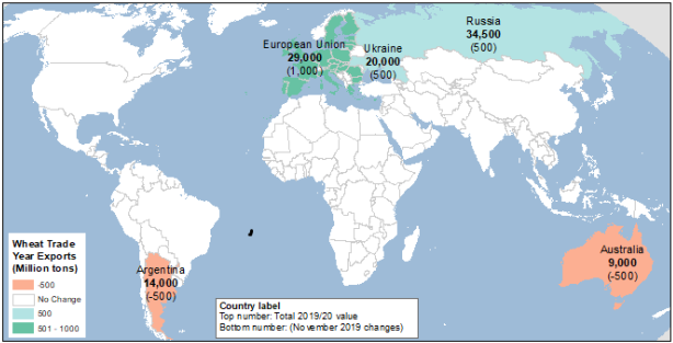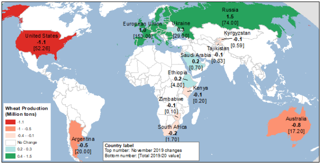 В этом месяце прогноз мирового производства пшеницы на 2019/20 г. незначительно повышен (на 0,3 млн. тонн), так как увеличение производства пшеницы за пределами США почти полностью нивелируется снижением для американской пшеницы. В этом месяце пересмотрены перспективы производства, среди прочих, для шести крупнейших экспортеров пшеницы — Австралии, Аргентины, Европейского союза (ЕС), России, Украины и США.
