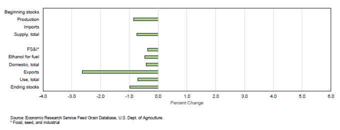 В результате этих изменений конечные остатки составят 1 910 млн. бушелей, что на 18,3 млн. меньше прогноза прошлого месяца. Коэффициент использования запасов снижен до 13,7 по сравнению с 13,8 в прошлом месяце.