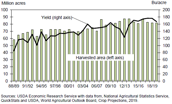 Рисунок 2. Уборочная площадь и урожайность кукурузы в США.