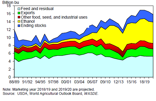 Экспорт этанола из США в 2018/19 г. составил 1 547 млн. галлонов, что на 4,7% ниже 2017/18 г. и соответствует примерно 550 млн. бушелей кукурузы. Основным сдерживающим фактором стали поставки этанола в Бразилию, которые сократились на 72 миллиона (16 процентов), поскольку заводы перешли от производства сахара к производству этанола взамен импорта. Поставки в Канаду и Индию также сократились. Китай упал с четвертого места по объему в 2017/18 году до тридцать четвертого из-за воздействия пошлин, сокративших экспортный спрос почти на 110 миллионов галлонов.