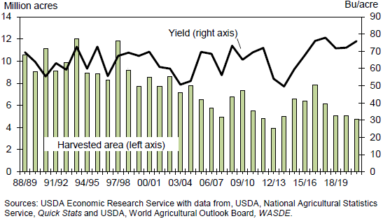 Рисунок 4. Уборочная площадь и урожайность сорго в США.