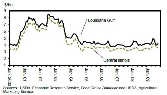 Рисунок 5. Цены на кукурузу по месяцам (yellow #2) в Центральном Иллинойсе и Луизиане.