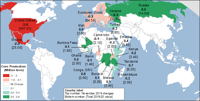 Карта 1. Изменения в производстве кукурузы (млн. тонн), ноябрь 2019.