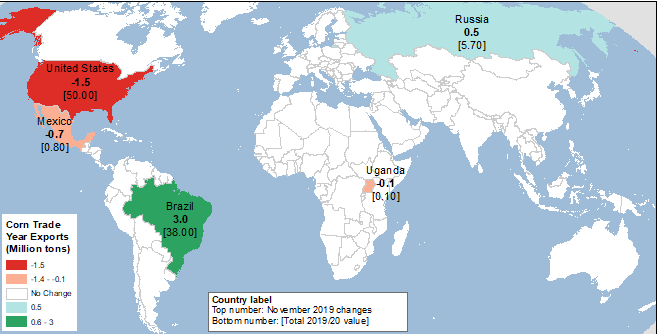 Карта 2. Изменения экспорта кукурузы для 2019/20 торгового года (млн. тонн), ноябрь 2019.