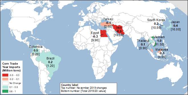 Прогноз импорта кукурузы во Вьетнам увеличен на 1,0 млн. тонн, что отражает быстрые темпы импорта, причем в сентябре импорт стал самым крупным за всю историю. Импорт также увеличен на 0,5 млн. тонн для Колумбии, где наблюдается устойчивый рост кормового потребления. На основании корректировок 2018/19 г. прогноз импорта кукурузы также повышен для Японии и Кореи. Частично это нивелируется сокращением для Ирана (на 0,5 млн. тонн) и Египта (на 0,3 млн. тонн), согласно новым данным. На карте 3 ниже показаны изменения импорта кукурузы для торгового года за ноябрь.