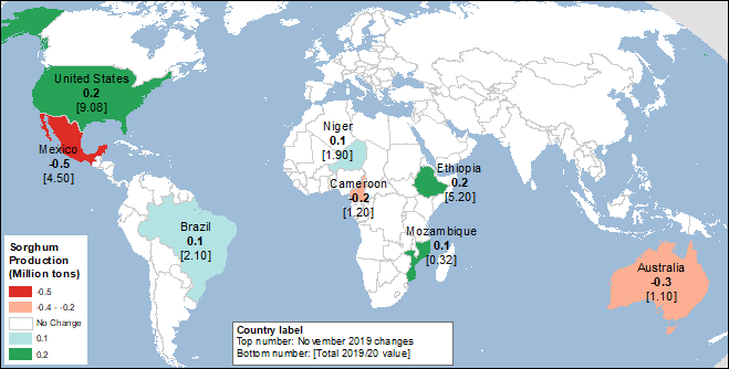 Оценка мирового производства сорго в 2019/20 году незначительно сократилась на 0,3 млн. тонн. Основная часть этого сокращения связана с прогнозируемым снижением производства в Мексике, Австралии и Камеруне. В частности, в Мексике произошло значительное сокращение производства на 0,5 млн. тонн, или на 10 процентов от прогнозируемого объема. Это снижение сконцентрировано в центральных регионах, где в отчетах о ходе посевов сообщается о самой низкой посевной площади яровых культур с 1993 года. Ожидается, что производство сорго в Австралии снизится из-за засухи в восточных районах Квинсленда и Нового Южного Уэльса, на которые приходится почти все производство сорго в стране. Ожидается, что австралийские фермеры будут иметь проблемы со всходами. Вместо того, чтобы собирать неспелый урожай зерна, фермеры, скорее всего, будут использовать часть его в качестве корма или сена, в зависимости от местных цен. Кроме того, цены на сорго в Австралии примерно на 10 процентов ниже, чем год назад, что не мотивирует к поздним посевам. Для нескольких стран Африки к югу от Сахары производство сорго немного увеличилось в этом месяце. Прогноз производства сорго в Соединенных Штатах увеличился в этом месяце на 0,2 млн. тонн до 9,1 млн. тонн. На карте 4 ниже показаны изменения производства сорго за ноябрь.
