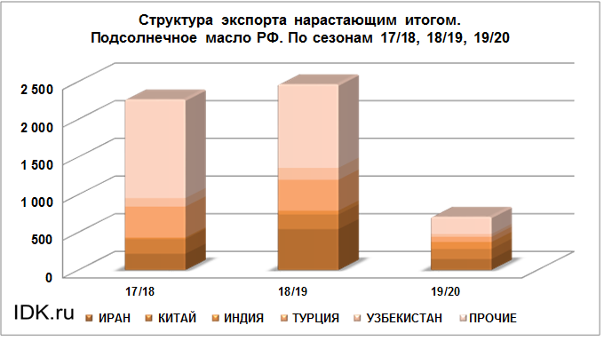 Структура экспорта подсолнечного масла из России нарастающим итогом по сезонам