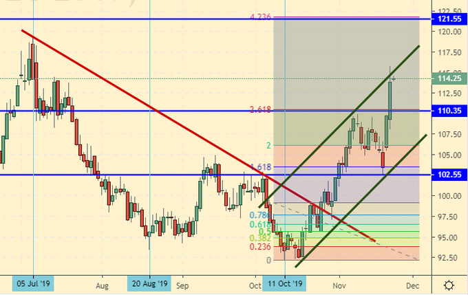Сценарий роста: рассматриваем декабрьский фьючерс, дата экспирации 18 декабря. Все складывается просто прекрасно. Цель на 120.00 видна невооруженным глазом. Держим лонги. При достижении цели позицию закрыть полностью.