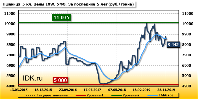 Цены на пшеницу 5-го класса понизились на 240 руб./т. и на данный момент составляют 9445 рублей за тонну.