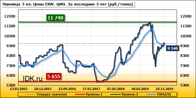 Цены на пшеницу 5-го класса понизились на 90 руб./т. и на данный момент составляют 9540 рублей за тонну.