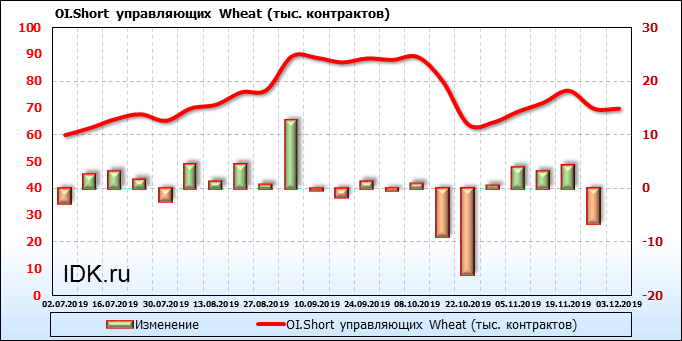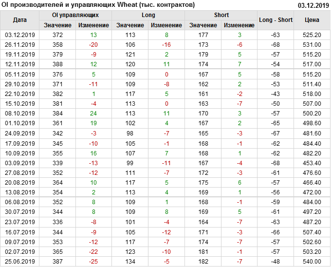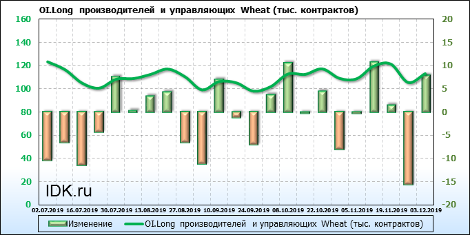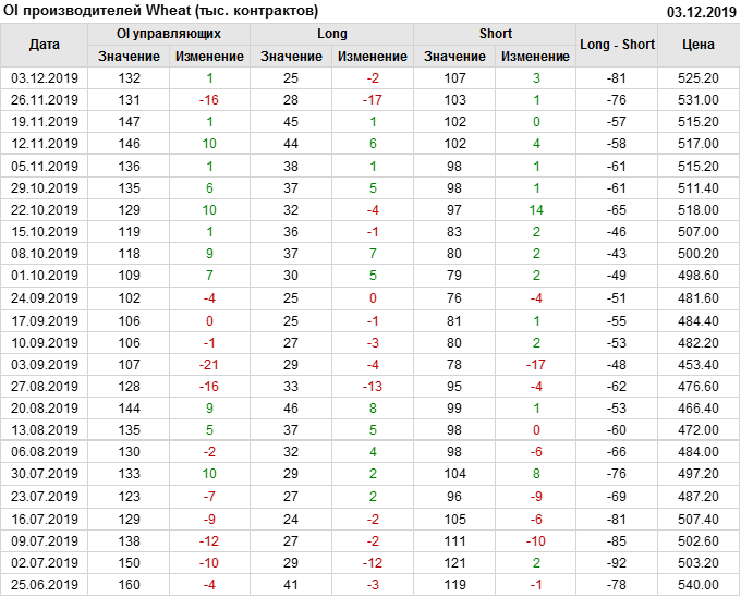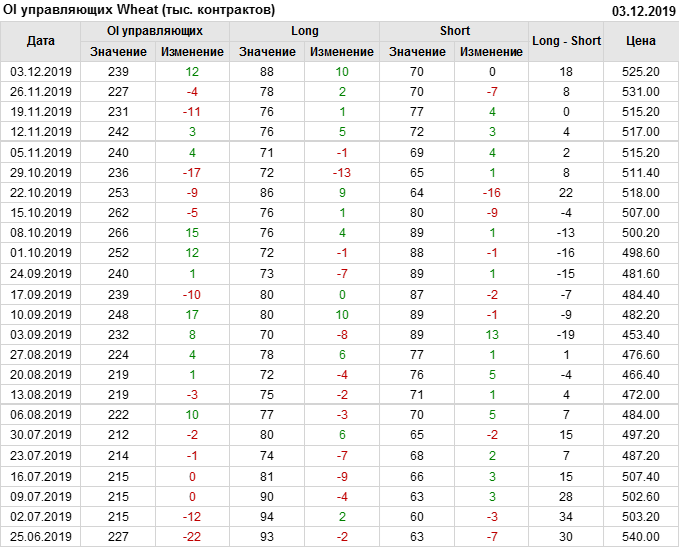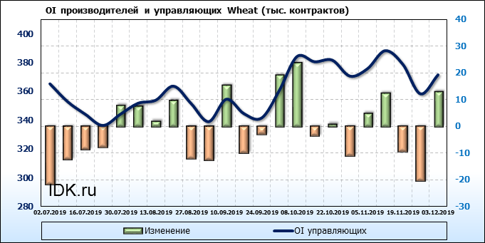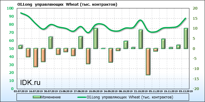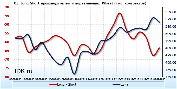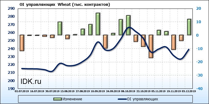 За прошлую неделю, 27.11.19 — 03.12.19, разница между длинными и короткими позициями управляющих выросла на 10 тыс. контрактов. В тоже время, цена упала на 5.8 цента. Управляющие наращивают длинные позиции, что отражает их видение возможностей роста цены в ближайшее время, и это несмотря на то, что цены на отчетной неделе падали. Если давление со стороны покупателей будет продолжено рынок развернется вверх.