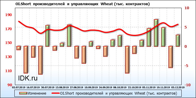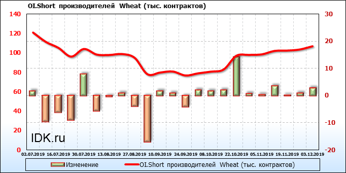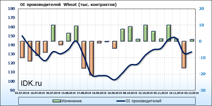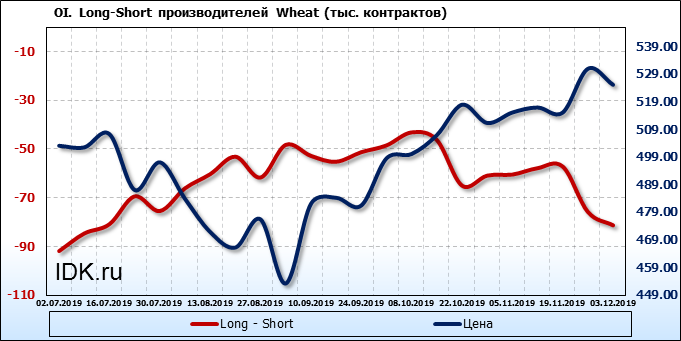 За прошлую неделю, 27.11.19 — 03.12.19, разница между длинными и короткими позициями производителей упала на 5 тыс. контрактов. В тоже время, цена упала на 5.8 цента. Производители наращивают короткие позиции, что не дает цене расти. В такой ситуации на рынке возможно ускорение падения цен.