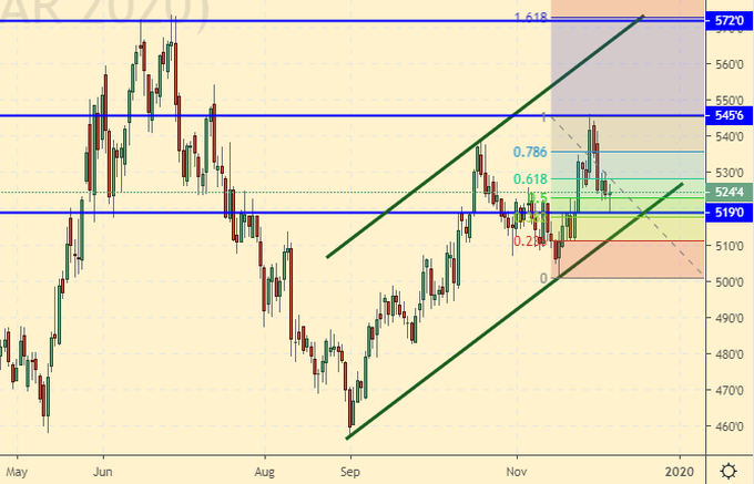 Сценарий падения: продавать будем или при подходе к 570.0, или будем думать о продажах после падения ниже 510.0. Если китайцы с американцами до конца недели не договорятся, рынок пшеницы может совершить ход в район 480.0.