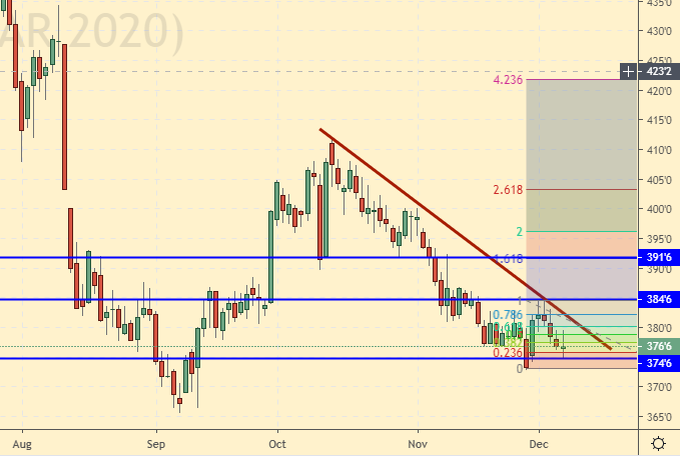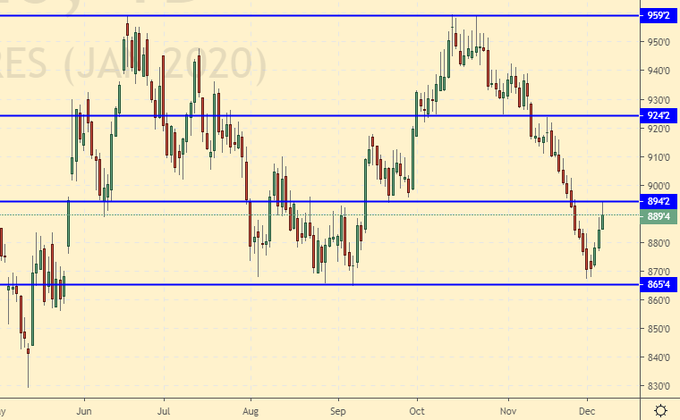 Сценарий роста: рассматриваем январский фьючерс, дата экспирации 14 января. Отскочили от 865.0. Информация о закупках Китаем сои в США поддержала цены. Однако, говорить о развороте рано. При касании 880.0 можно купить.