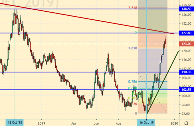 Сценарий роста: рассматриваем декабрьский фьючерс, дата экспирации 18 декабря. Взяли 120.0, всех с профитом. Однако, мы прошли выше. Это несколько неожиданно. Наверху у нас есть цель на 138.0, поэтому откат к 116.0 можно использовать для повторного входа в лонг.