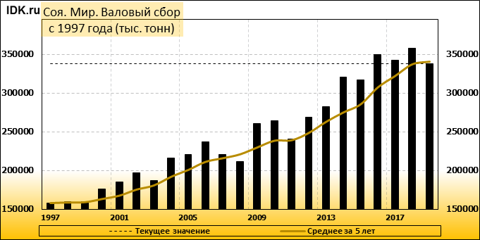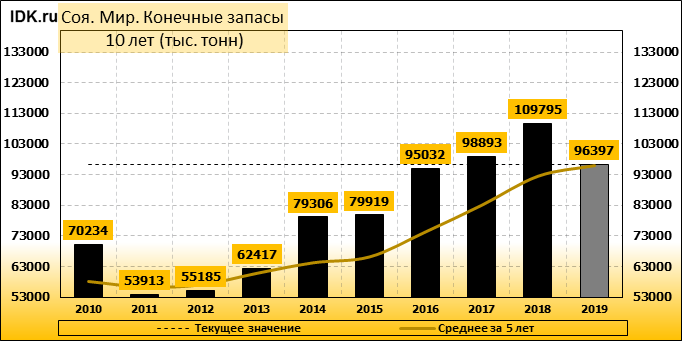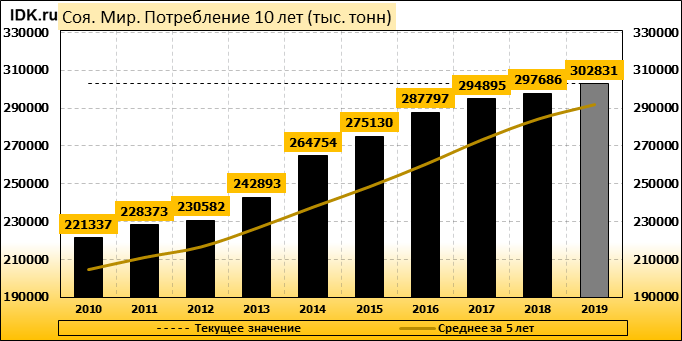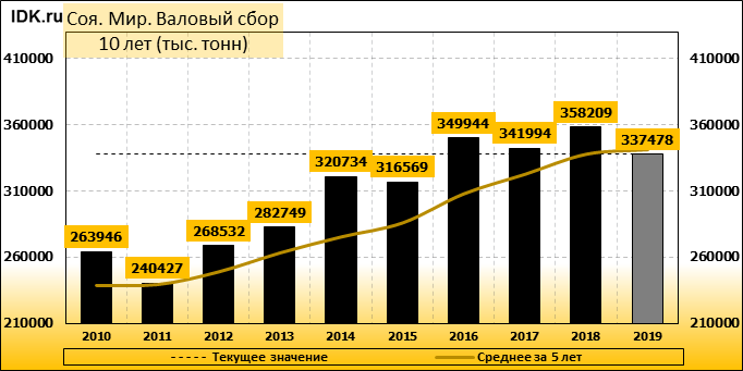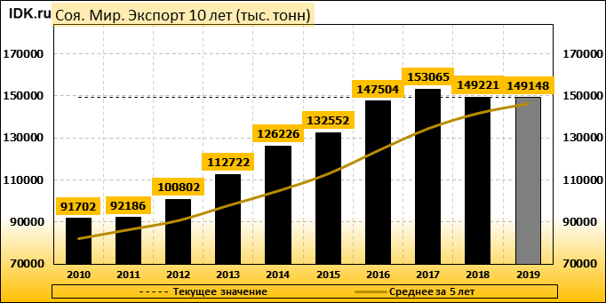 Прогноз мирового производства сои на 2019/20 год повышен на 0,92 млн. тонн до 337,48 млн. тонн. Согласно прогнозам Национального бюро статистики, производство сои в Китае увеличено на 1,0 млн. тонн до 18,1 млн., что отражает увеличение площади и урожайности. Мировой экспорт сои в 2019/20 году сокращен на 0,6 млн. тонн до 149,0 млн. на фоне снижения прогноза для Аргентины. Импорт сои во Вьетнам сокращен, что компенсируется увеличением импорта соевого шрота. Прогноз мировых остатков сои в этом месяце повышен за счет увеличения в Китае и Бразилии.