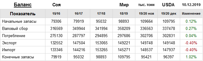 За прошедший месяц министерство сельского хозяйства США (USDA) на 10.12.2019 пересмотрело Баланс сои для Мира в сезоне 19/20 следующим образом: