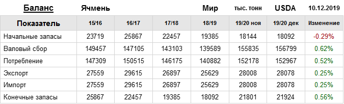За прошедший месяц министерство сельского хозяйства США (USDA) на 10.12.2019 пересмотрело Баланс ячменя для Мира в сезоне 19/20 следующим образом:
