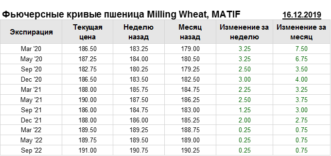 На 16.12.2019 стоимость пшеницы Milling Wheat на бирже MATIF по контракту Mar ’20 составила 186.5 евро за тонну. За прошедшую неделю стоимость пшеницы Milling Wheat выросла на 3.25 евро/тонна. Как мы видим на графике, фьючерсная кривая имеет периоды, когда более дальний фьючерс дешевле ближнего. Состояние бэквардации наблюдаем на следующих контрактах: Sep ’20, Sep ’21. Таким образом, трейдеры предполагают, что возможно превалирование предложения над спросом в указанные периоды.