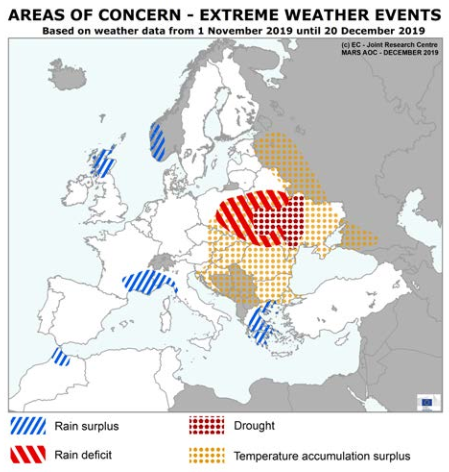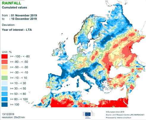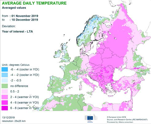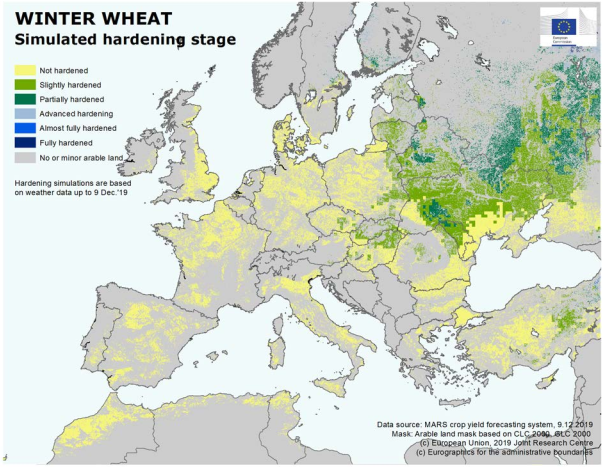 Температурные условия были значительно более мягкими, чем обычно, в обширных частях Европы, особенно с начала октября до середины ноября в центральной, восточной и юго-восточной Европе. Следовательно, закалка озимой пшеницы началась намного позже, чем обычно, и морозостойкость оставалась слабой, за исключением самых северных районов, где культивирование озимой пшеницы является незначительным.