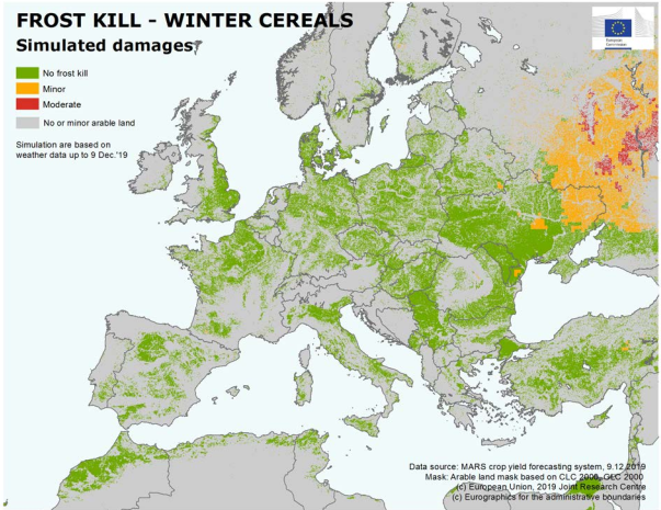 Около 20 ноября холодный воздушный фронт достиг южной части России и восточной Украины. Сочетание недостаточной морозоустойчивости сельскохозяйственных культур, отсутствия защитного снежного покрова и низких минимальных температур (в основном от -20 ° С до -13 ° С, и локально до — 25 ° С в восточной части Поволжья) могло привести к случаям вымерзания в течение последней декады ноября. Моделирование вымерзания MARS предполагает незначительные повреждения от вымерзания озимой пшеницы на востоке Украины и вдоль западной границы России, в то время как умеренное (локально значительное) повреждение от вымерзания, вероятно, произошло в восточных частях Центрального округа (например, Рязанская область), северо-восточной части Южного округа (например, Волгоградская область), а также в Поволжье (особенно в западной и южной частях).