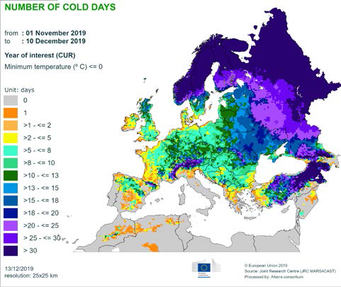 Согласно текущему прогнозу погоды (до 20 декабря), более теплые, чем обычно, условия, вероятно, сохранятся, с наиболее выраженными теплыми аномалиями (до 8 °C выше долгосрочного среднего) в восточной и юго-восточной Европе. Как следствие, в этот период не ожидается никаких повреждений от заморозков, но закалка не будет прогрессировать, и некоторые регионы будут даже терять морозостойкость.