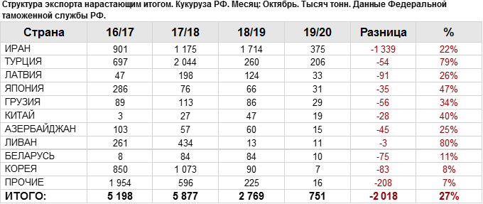 Объем поставок кукурузы на экспорт за период с июля 2019 года по октябрь 2019 года в Иран составил 374.97 тыс. тонн, что на 69.98 тыс. тонн больше объема поставок в данную страну в прошлом сезоне на тот же отчетный месяц.