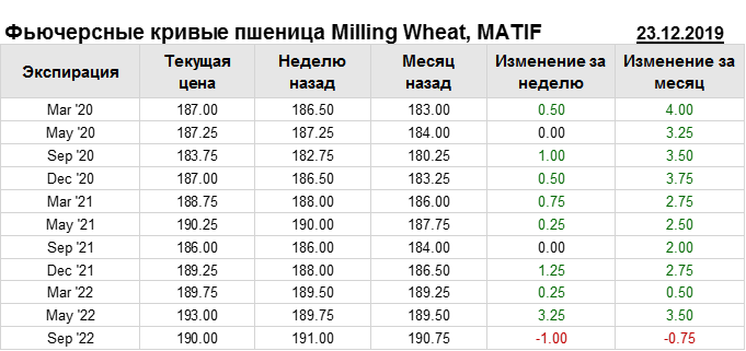 На 23.12.2019 стоимость пшеницы Milling Wheat на бирже MATIF по контракту Mar ’20 составила 187 евро за тонну. За прошедшую неделю стоимость пшеницы Milling Wheat выросла на 0.5 евро/тонна. Как мы видим на графике, фьючерсная кривая имеет периоды, когда более дальний фьючерс дешевле ближнего. Состояние бэквардации наблюдаем на следующих контрактах: Sep ’20, Sep ’21, Sep ’22. Таким образом, трейдеры предполагают, что возможно превалирование предложения над спросом в указанные периоды.
