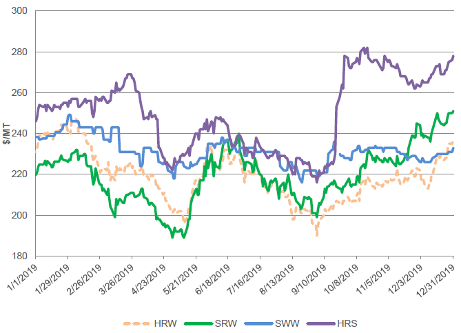 Цены на американские сорта пшеницы выросли в декабре, чему способствовали высокие экспортные продажи и потенциал торговли с Китаем. Hard Red Winter (HRW) и Soft Red Winter (SRW) выросли на 14 долларов США за тонну и 6 долларов США за тонну соответственно до 237 долларов США и 251 доллара США при поддержке со стороны засушливых условий для недавно посаженной (2020/21) озимой пшеницы. Пшеница Soft White Winter (SWW) прибавила 5 долларов за тонну до 233 долларов, а Hard Red Spring (HRS) выросла на 14 долларов за тонну до 278 долларов.