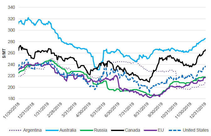 В целом, экспортные цены в декабре укрепились. Цены в ЕС и России поддерживались высоким международным спросом. В дополнение к высоким темпам экспорта, цены в ЕС также испытывали поддержку со стороны влажных погодных условий в странах на западе блока. Цены в США поддерживались успехами в торговых переговорах с Китаем, что создавало позитивный настрой в отношении потенциальных продаж на этот рынок. Цены в Аргентине выросли на фоне сильных экспортных продаж накануне недавнего решения правительства о повышении экспортных пошлин на пшеницу, кукурузу и сою. Цены в Австралии выросли еще больше из-за ограниченных запасов. Цены в Канаде выросли в связи с высоким международным спросом.