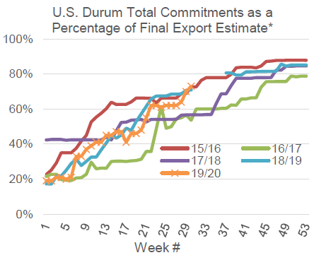 До настоящего времени экспорт дурума осуществлялся более высокими темпами, чем в прошлом году. По состоянию на 26 декабря общий объем обязательств по поставкам дурума почти вдвое превышает прошлогодний и опережает темпы, необходимые для достижения прогнозируемого показателя на конец года в 40 миллионов бушелей. Обязательства перед Европейским Союзом особенно высоки в этом году.