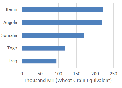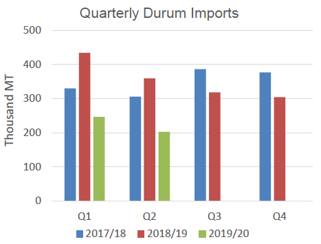 Импорт пшеницы дурум в США прогнозируется на уровне 40 млн. бушелей (1,1 млн. тонн) по сравнению с 52 млн. бушелей (1,4 млн. тонн) в прошлом году. Квартальные темпы импорта в этом году заметно замедлились, несмотря на уменьшение внутреннего урожая. Стоит отметить, что эти статистические данные включают муку и продукты переработки (манная крупа, кускус и т. д.). Импорт продуктов переработки в этом году был относительно стабильным, но импорт зерна значительно сократился.