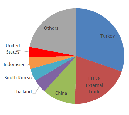 Мировая торговля пастой в 2018/19 году составила более 5,5 млн. тонн (в пересчете на зерно), причем на долю двух крупнейших экспортеров, Турции и Европейского союза, пришлось около половины от общего объема. Несмотря на то, что обе страны производят некоторое количество твердой пшеницы, их экспортно-ориентированные производства зависят от импортных поставок.