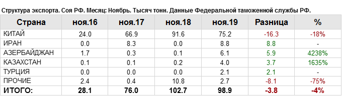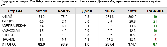 Структура экспорта сои из России за ноябрь 2019 года
