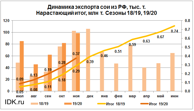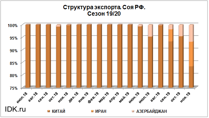 Объем поставок сои на экспорт за период с июля 2019 года по ноябрь 2019 года в Азербайджан составил 13.6 тыс. тонн, что на 12.91 тыс. тонн больше объема поставок в данную страну в прошлом сезоне на тот же отчетный месяц.