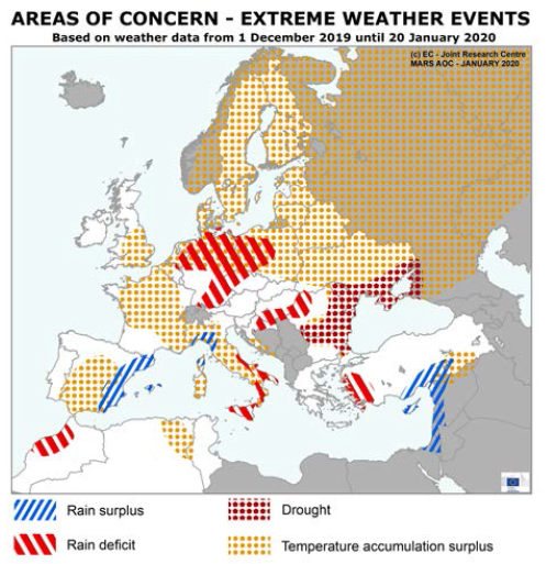 Кроме того, в некоторых частях Европы погодные условия были намного более сухими, чем обычно, в том числе продолжительная нехватка осадков в южной Италии (в наиболее важных регионах для твердой пшеницы), в обширных частях Германии, западной Польше и западной Чехии, большой части Балканского региона, Болгарии, Румынии, центральной и западной Украине, западной Турции и западном Марокко. В некоторых из этих регионов с осени преобладали сухие условия. Зимой эти условия в основном влияют на влажность почвы и пополнение грунтовых вод, а не оказывают непосредственное влияние на посевы.