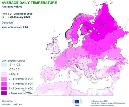 Более теплые, чем обычно, погодные условия наблюдались по всей Европе. Во многих частях Европы этот период с 1 декабря по 20 января стал одним из самых теплых в истории наблюдений MARS (с 1979 года). На Пиренейском полуострове, в Италии, юго-восточной Европе, Соединенном Королевстве, Ирландии и Турции среднесуточные аномалии температуры по отношению к долгосрочному среднему (LTA) были в основном ограничены 2 ° C. В центральной Европе аномалии колебались от 2 ° C до 4 ° C. В восточной и северной Европе сообщалось о температурных аномалиях от 4 ° C до 6 ° C. На северо-западе России и в части Финляндии наблюдались среднесуточные аномалии температуры от 6 до 8 ° C. Дневные максимальные и минимальные температуры имели одинаковую пространственную структуру с очень высокими теплыми аномалиями (более 8 ° C) на большой территории северо-запада России.