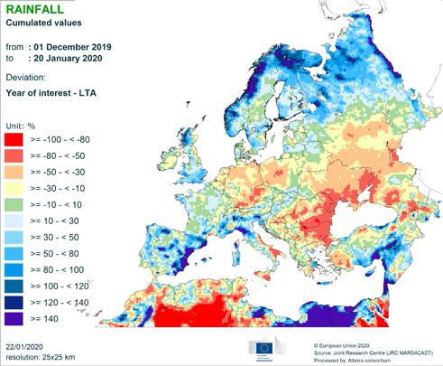 Температурные условия были намного более мягкими, чем обычно, в большей части Европы с начала декабря. С начала января процесс закалки прогрессировал в Балканском регионе и на большой территории между Чехией и Украиной. Морозостойкость озимых зерновых остается слабой в южной и западной Европе. В Центральной Европе и в регионах вблизи Балтийского, Черного и Каспийского морей озимые зерновые частично закалены, в то время как в Северной Европе и восточной половине европейской части России преобладает сильное закаливание. По сравнению со средним уровнем закаливание озимых культур остается особенно слабым в южной части Швеции, Германии, Польше, странах Балтии, Беларуси, на северо-западе европейской части России и в западной Украине.