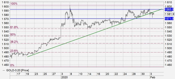 Золото: Западный мир начинает привыкать к мысли, что где-то там, в далеком китайском Ухане есть какой-то вирус. Котировки золота вчера проявили склонность к падению. Разворота тренда вниз мы не ждем, но некоторая коррекция напрашивается, тем более, что американский фондовый рынок не стал поддаваться китайской панике и даже несколько вырос. Сегодня по золоту возможен шорт.