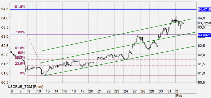 Рубль: ждем удара в 64.50. При достижении данной отметки можно продать, можно зафиксировать прибыль от покупки. Смотрим на рынок нефти. Если там дела будут совсем плохи – котировки уйдут ниже 50.00 по Brent, то никакого смысла фиксировать прибыль на 64.50 у нас не будет, так как в этом случае цели сместятся к 70.00.