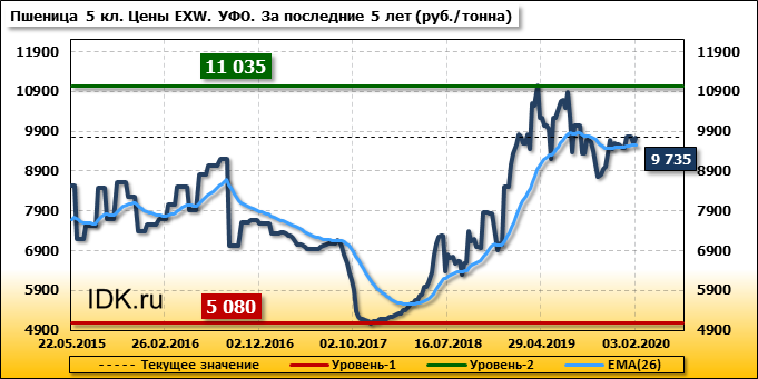 Цены на пшеницу 5-го класса повысились на 135 руб./т. и на данный момент составляют 9735 рублей за тонну.