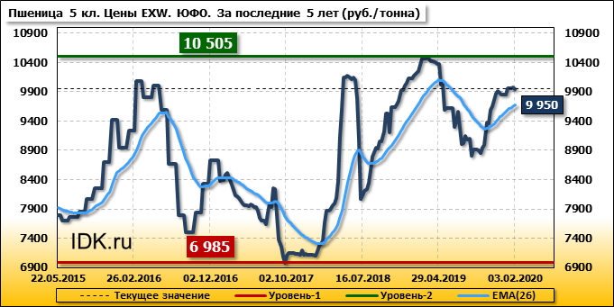 Цены на пшеницу 5-го класса понизились на 20 руб./т. и на данный момент составляют 9950 рублей за тонну.