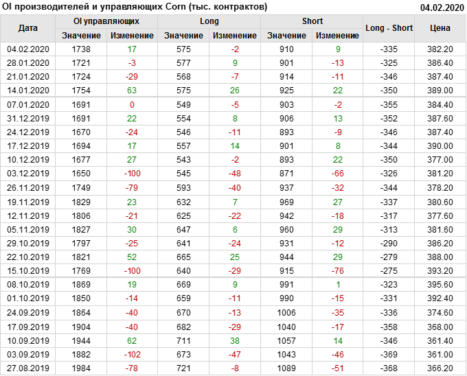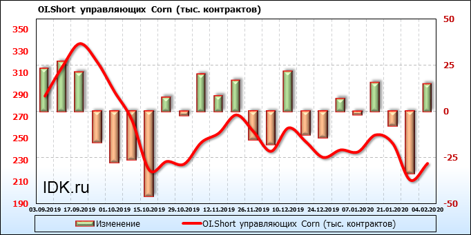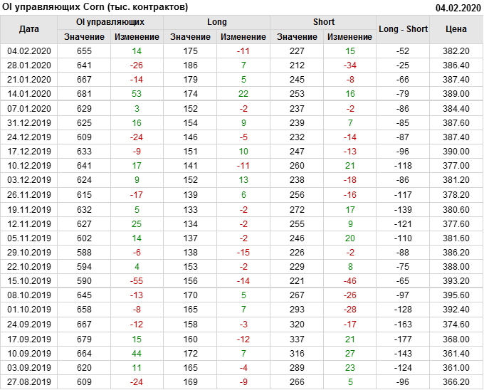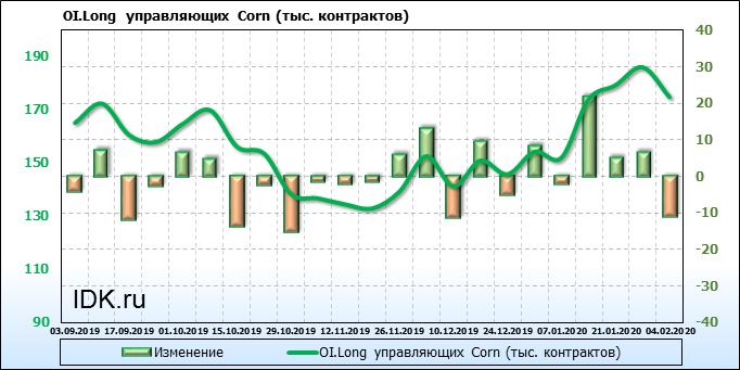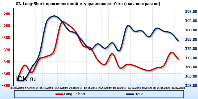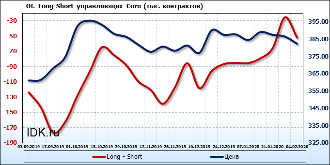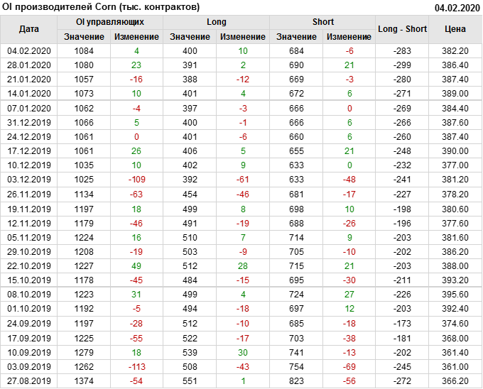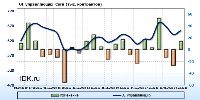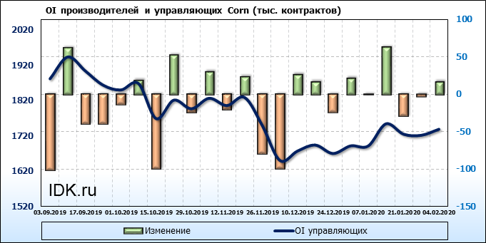 За прошлую неделю, 29.01.20 — 04.02.20, разница между длинными и короткими позициями производителей и управляющих упала на 11 тыс. контрактов. За отчетный период времени, цена упала на 4.2 цента. Производители и управляющие на отчетной недели были склонны продавать. Суммарное число шортов было выше суммарного числа лонгов. Цены также снижаются, что создает привлекательные условия для продавцов в среднесрочной перспективе, одна — две недели.