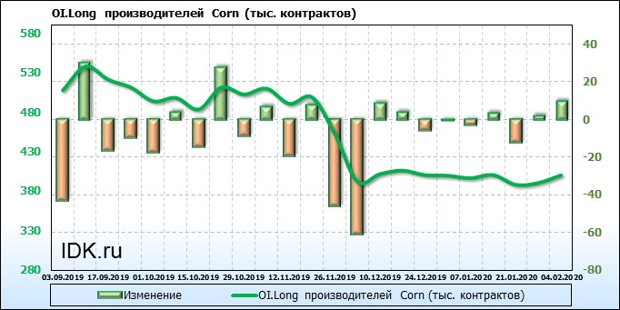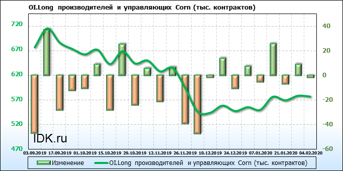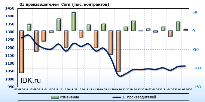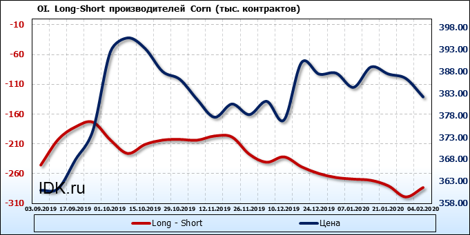 За прошлую неделю, 29.01.20 — 04.02.20, разница между длинными и короткими позициями производителей выросла на 16 тыс. контрактов. В тоже время, цена упала на 4.2 цента. Производители перестали наращивать короткие позиции, что говорит или о непривлекательности текущих ценовых уровней для хеджирования, или о том, что часть участников рынка заняла выжидательную позицию.