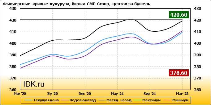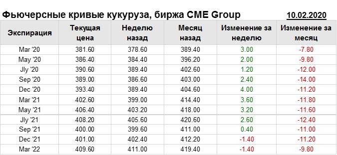 На 10.02.2020 стоимость кукурузы на бирже CME Group по контракту Mar ’20 составила 381.6 цента за бушель. За прошедшую неделю стоимость кукурузы на площадке CME Group выросла на 3 цента/бушель. Как мы видим на графике, фьючерсная кривая имеет периоды, когда более дальний фьючерс дешевле ближнего. Состояние бэквардации наблюдаем на следующих контрактах: Sep ’20, Sep ’21. Таким образом, трейдеры предполагают, что возможно превалирование предложения над спросом в указанные периоды.