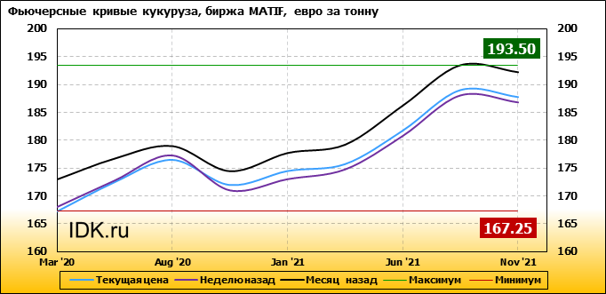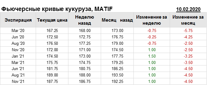 На 10.02.2020 стоимость кукурузы на бирже MATIF по контракту Mar ’20 составила 167.25 евро за тонну. За прошедшую неделю стоимость кукурузы на европейской площадке упала на 0.75 евро/тонна. Как мы видим на графике, фьючерсная кривая имеет периоды, когда более дальний фьючерс дешевле ближнего. Состояние бэквардации наблюдаем на следующих контрактах: Nov ’20, Nov ’21. Таким образом, трейдеры предполагают, что возможно превалирование предложения над спросом в указанные периоды.